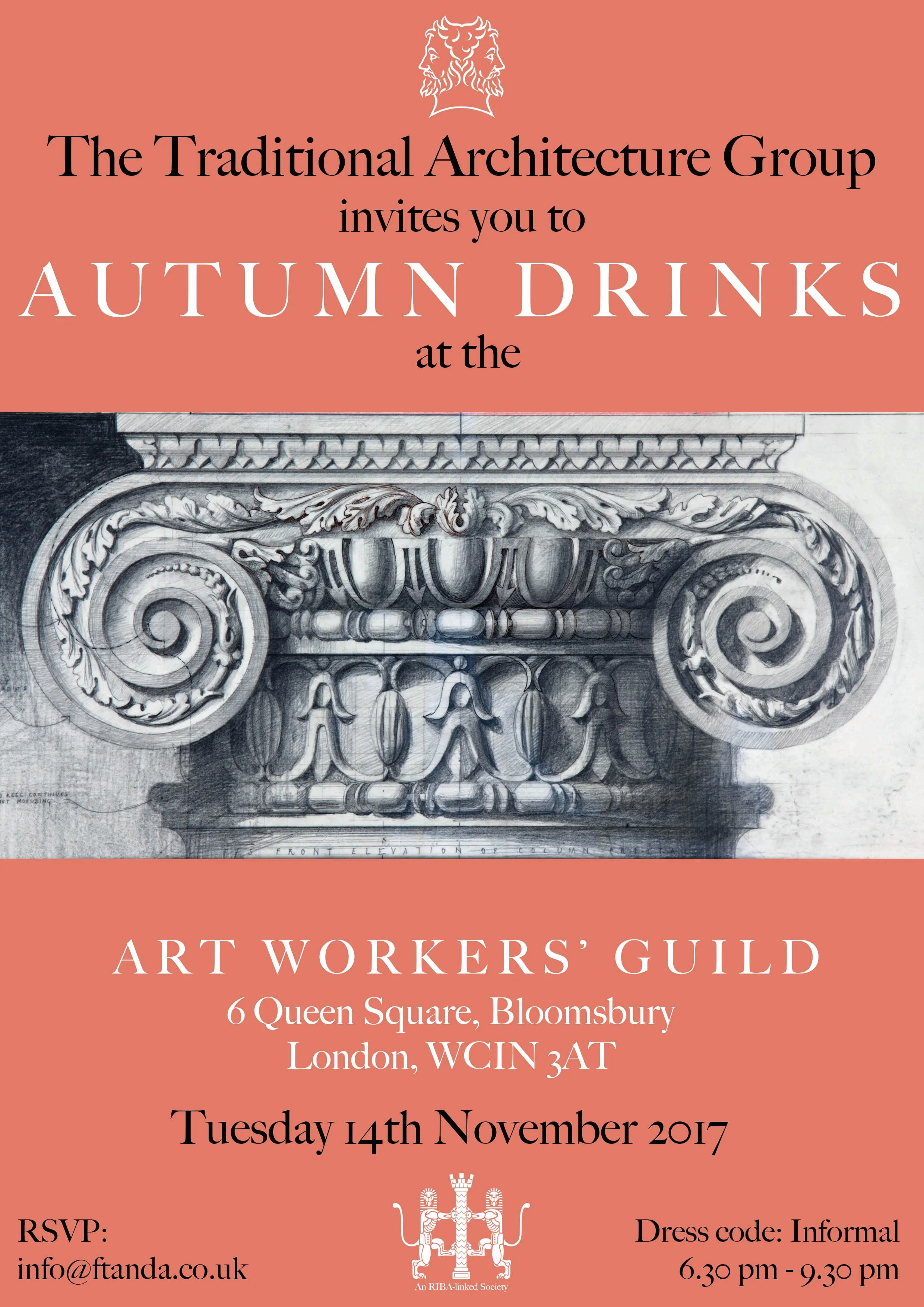 Join us at The Art Workers' Guild, 6 Queen Square, London, WC1N 3AT on Tuesday 14th November from 6.30pm to 9.30pm for drinks and a chat. It will be a great chance for members and friends to catch up, to meet our new Chairman and hear about TAG's plans for the future. In addition, Simon Hurst our Communications Secretary, will be giving a tour of the newly refurbished and glazed over inner courtyard he has designed in his role as Honorary Architect to the AWG. We look forward to seeing as many of you as possible. RSVP here.
